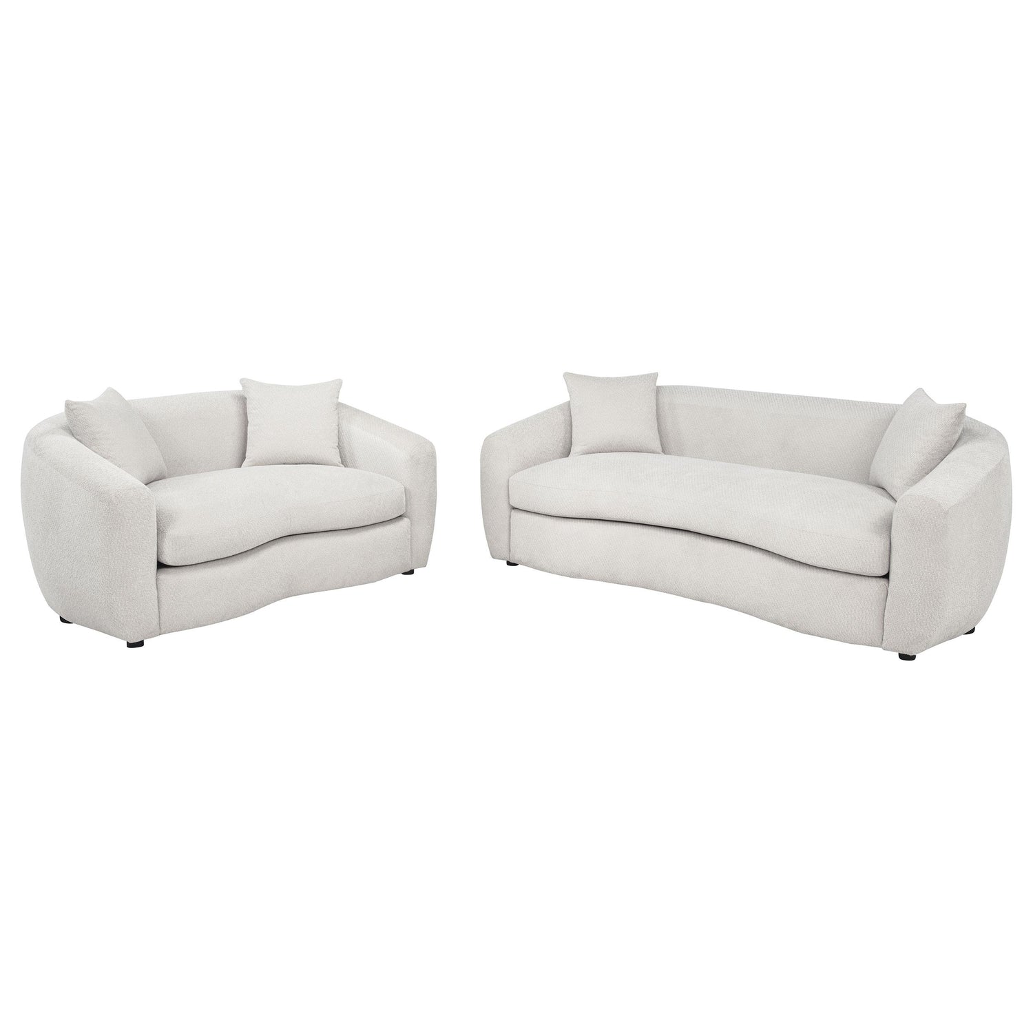 Stationary sofa set creates a coordinated living room arrangement with rounded silhouettes, sloped arms, and a softly sculpted contemporary profile. Tight backs and broad seats keep the grouping clean and composed while supporting everyday lounging. Black legs add contrast beneath the low frames, and durable wood construction with foam cushioning creates comfortable seating for family rooms, conversation areas, and open-plan living spaces.