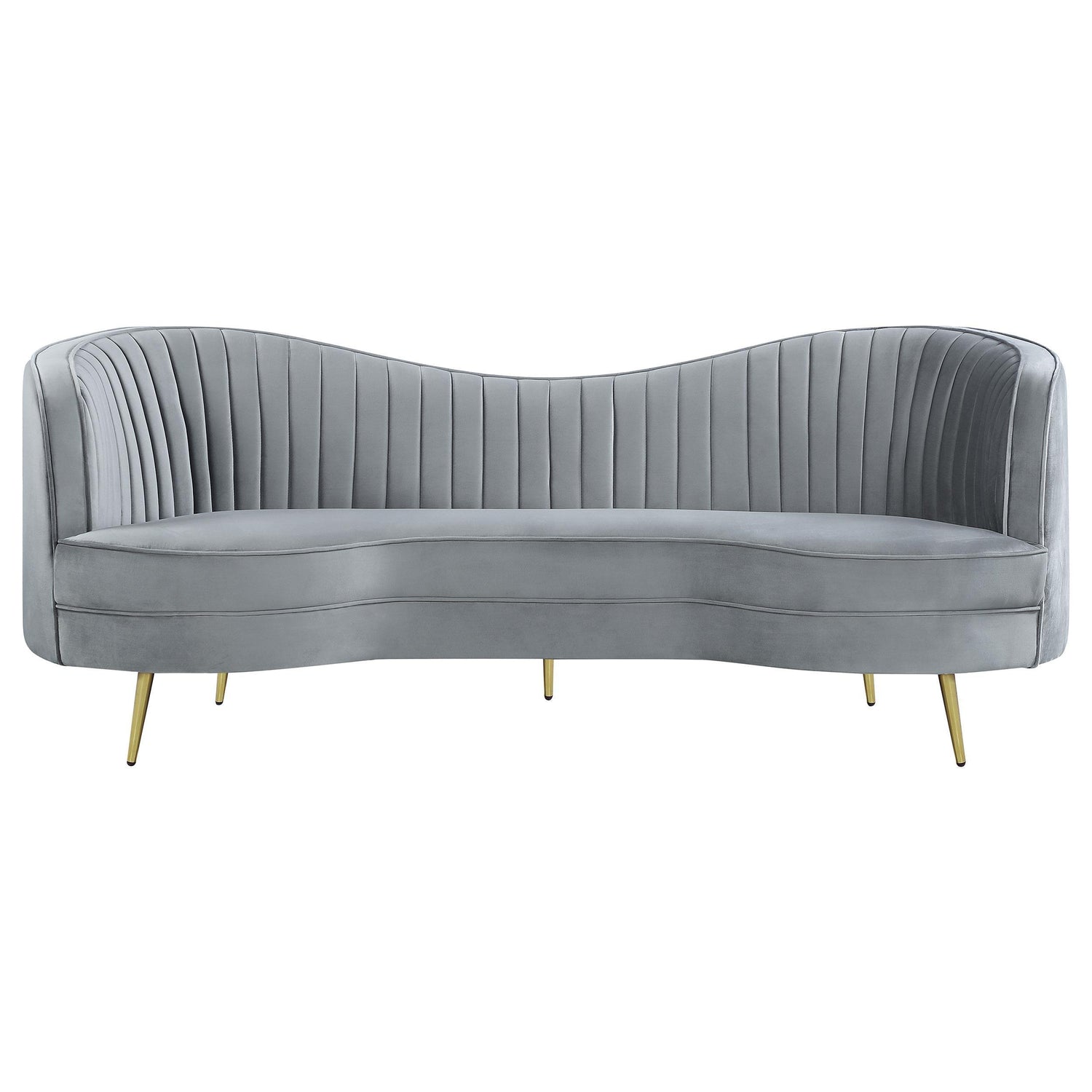 Inspired by a glam version of mid-century artistry, this three-piece sofa set offers all that’s needed to begin a romantic living space motif. Give a living room or family room its best design life with this set built with frames fully encased in solid wood and covered in decadent gray velvet. Vertical channeling on back interiors highlights the iconic kidney shape of its sofa and loveseat and add dimensionality to an extra comfy accent chair. Set atop slender, tapered legs fashioned of gold finish stainless steel, each piece reflects the parlor look of upscale retro furnishings. Set includes one sofa, one loveseat, and one chair.