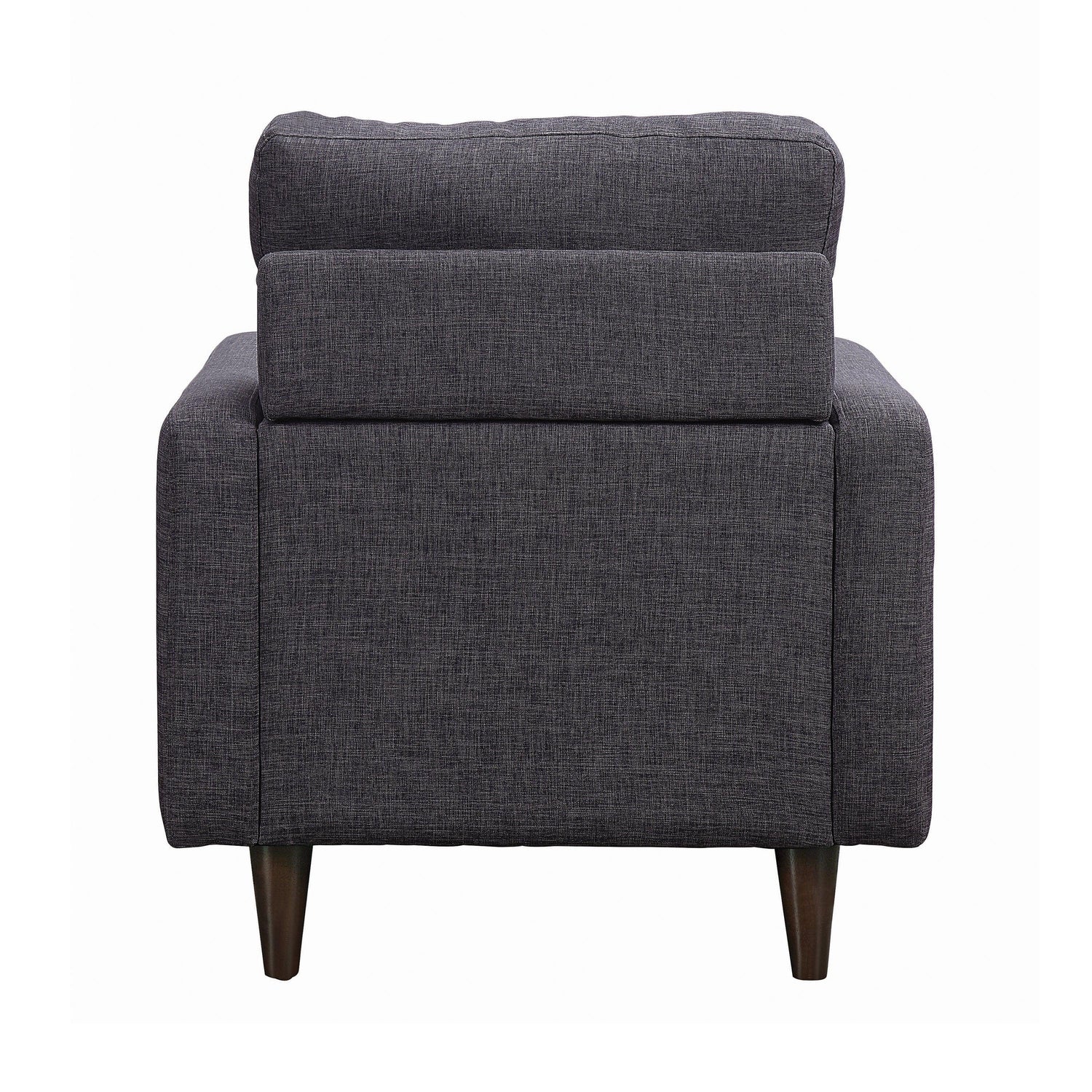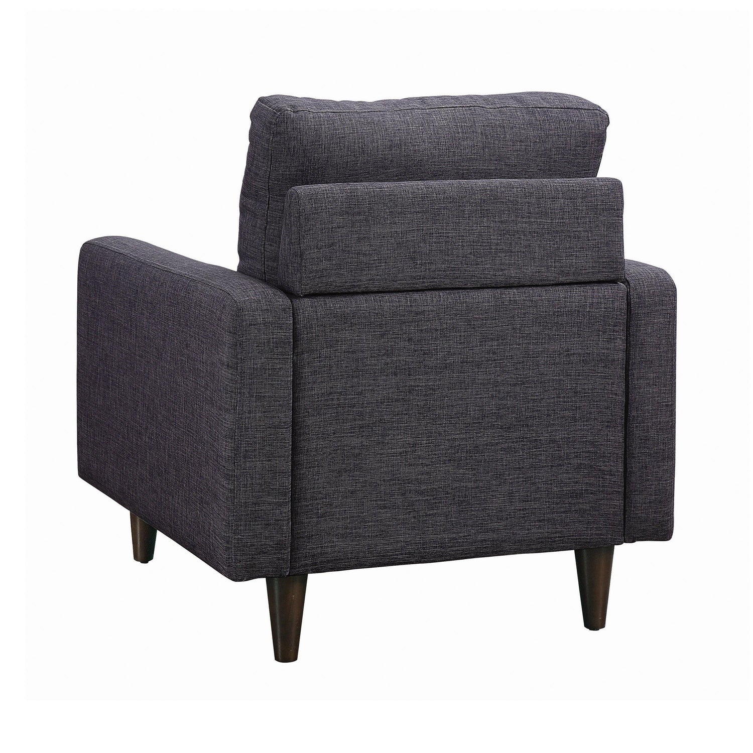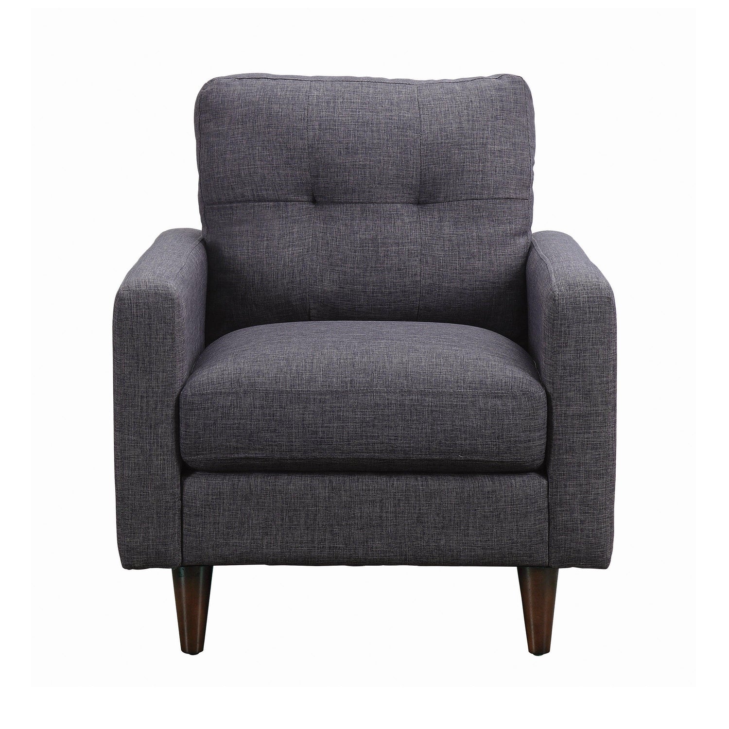 This armchair is an attractive accent for any living room or rec room. It features round tapered legs and armrests with clean, straight lines. Sumptuous seat cushions ensure afternoons and evenings of comfortable relaxation. Button-tufted seatback adds a touch of timeless panache. Wrapped in dark grey fabric that's suitable for any home decor.