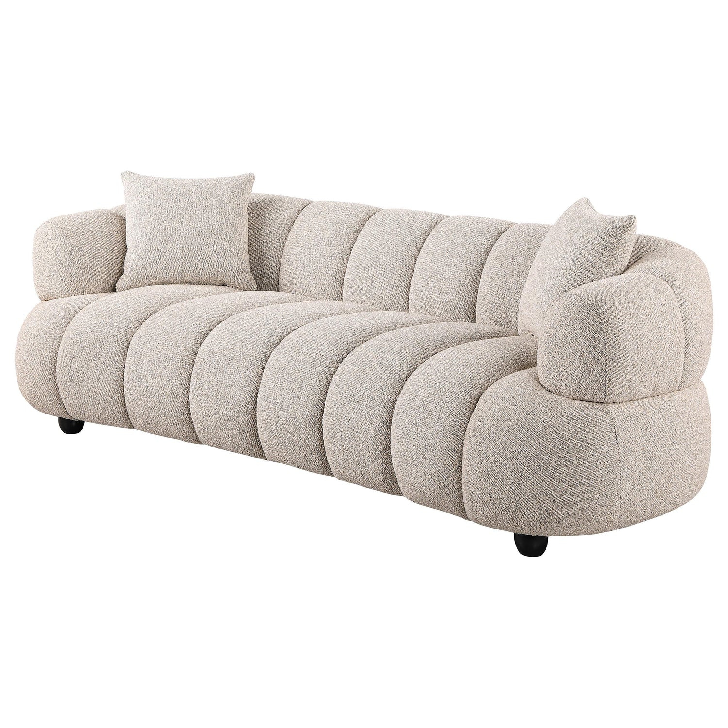 Channel tufted boucle sofa brings sculpted curves and ribbed comfort to any room. A plywood and wood frame supports foam cushioning with polyester fiber fill, wrapped in 100% polyester boucle. Rounded arms and a low profile keep the silhouette clean, while loose back pillows add relaxed support. Vertical channeling across the seat and back creates dimensional style. Use this couch to anchor a living room and invite everyday lounging.